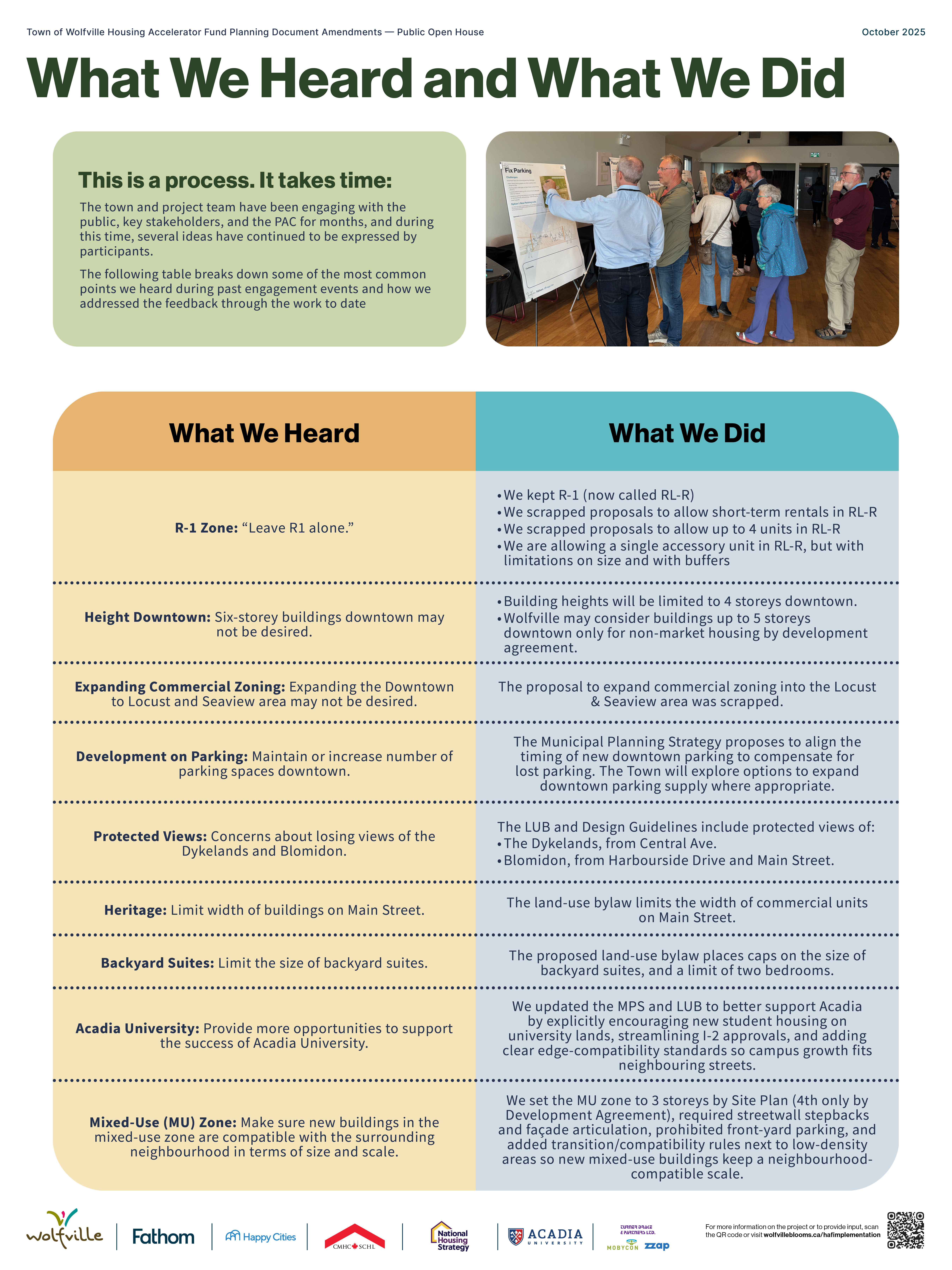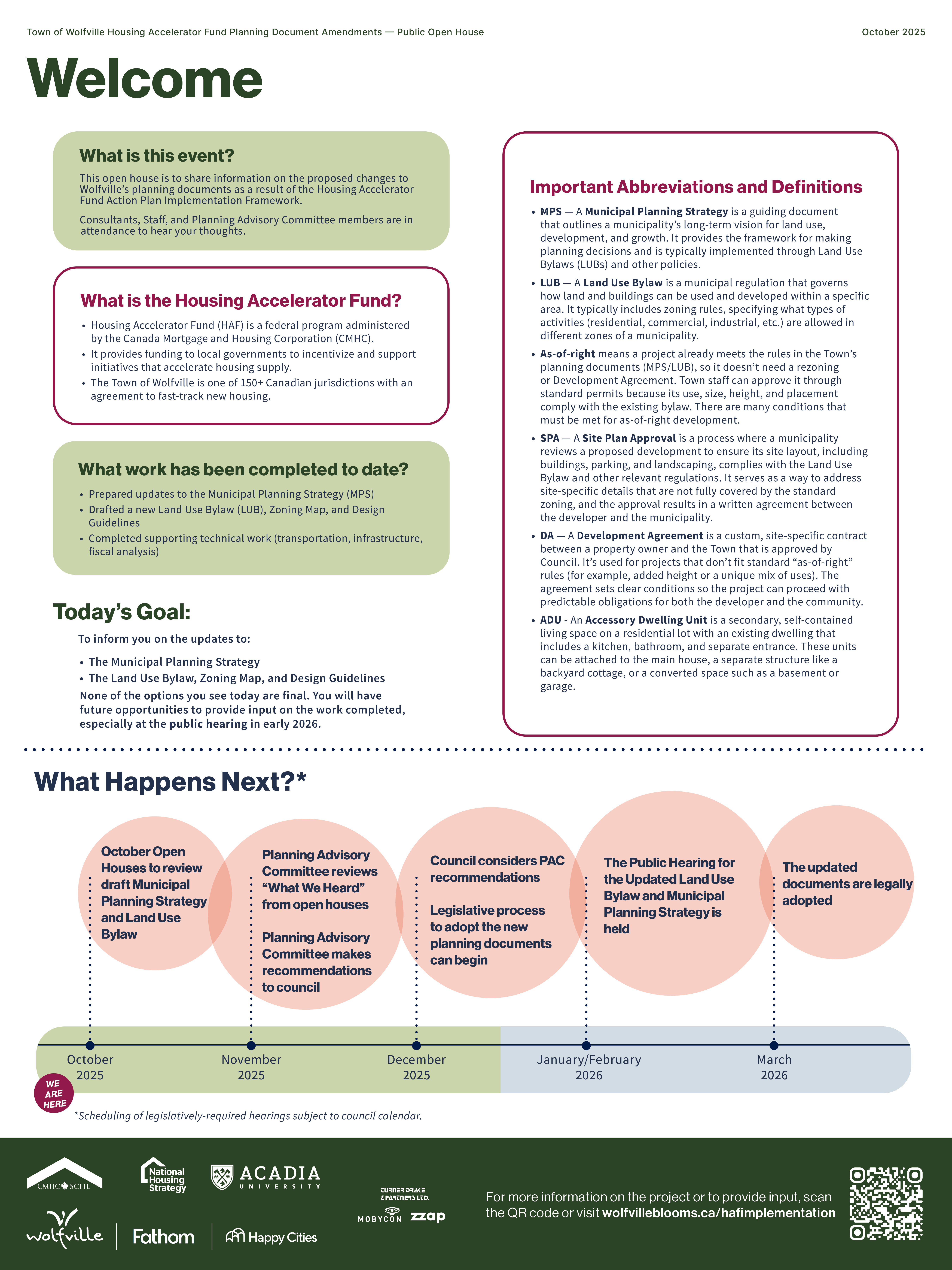 Community Engagement: Thank you for attending the open houses that were held on October 29 and 30th at the Wolfville Legion. To view all of the material that was shown at the open houses, please click the "HAF Open House Boards October 2025" on the right. A couple of boards are displayed below. Next steps in this process:November 13: Planning Advisory Committee will receive a summary of feedback from the Open Houses and will be asked for a motion to Council to adopt the Draft Planning Documents (Municipal Planning Strategy and Land Use Bylaw) subject to key areas of consideration. December: Council will consider the recommendation from Planning Advisory Committee. If Council motions to adopt the Planning Documents (subject to amendments of their choosing) the legislative process to adopt the documents will begin with advertising for a Public Hearing. January 2026: A Public Hearing will be held following an advertising period. January or February 2026: Council will give Second Reading to the motion to adopt the Planning Documents following the Public Hearing March 2026: The documents are legally adopted. |